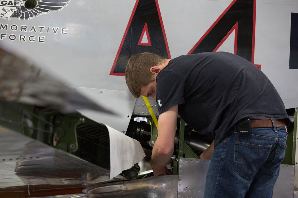 Mark Tisler inspecting the left wheel well. Mark has a long history with the Red Tail. He has been involved with this P-51C through its two restorations at Tri-State and now the repair being done at AirCorps.