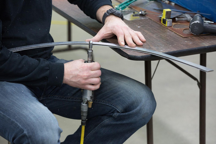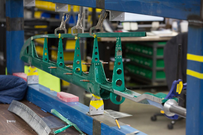 Hunter squeezes the rivets that attach the stringers to the ribs.