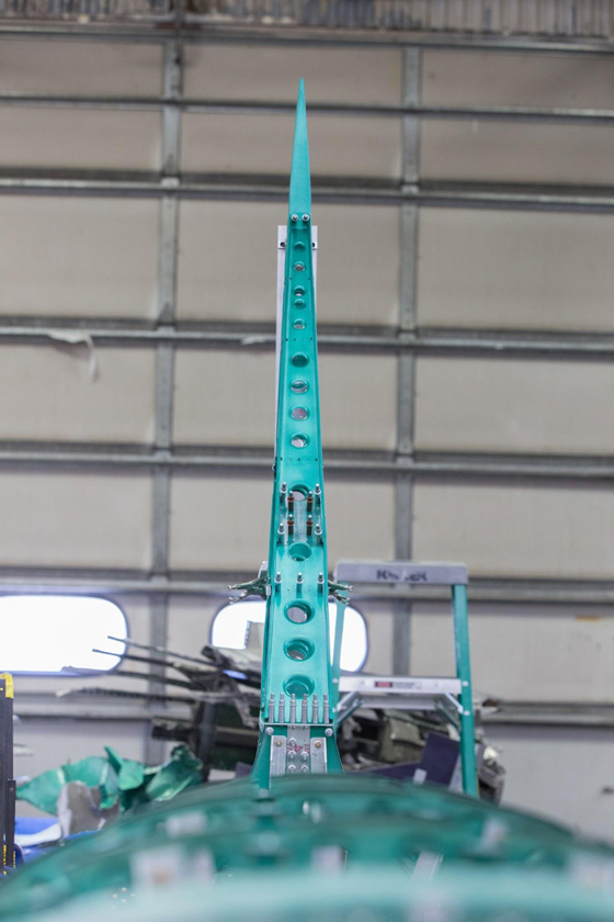 If you look carefully in this shot and many others in this update, you can see some of the ribs are drilled for rivets and others are not. Those parts that are drilled in these images are pieces that are being reused and the ones without drilled holes are replacement parts.