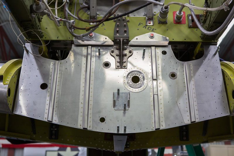 Behind the pilot’s seat is the period correct radio installation. At the top is the communications relay box which connects to the comm antenna.