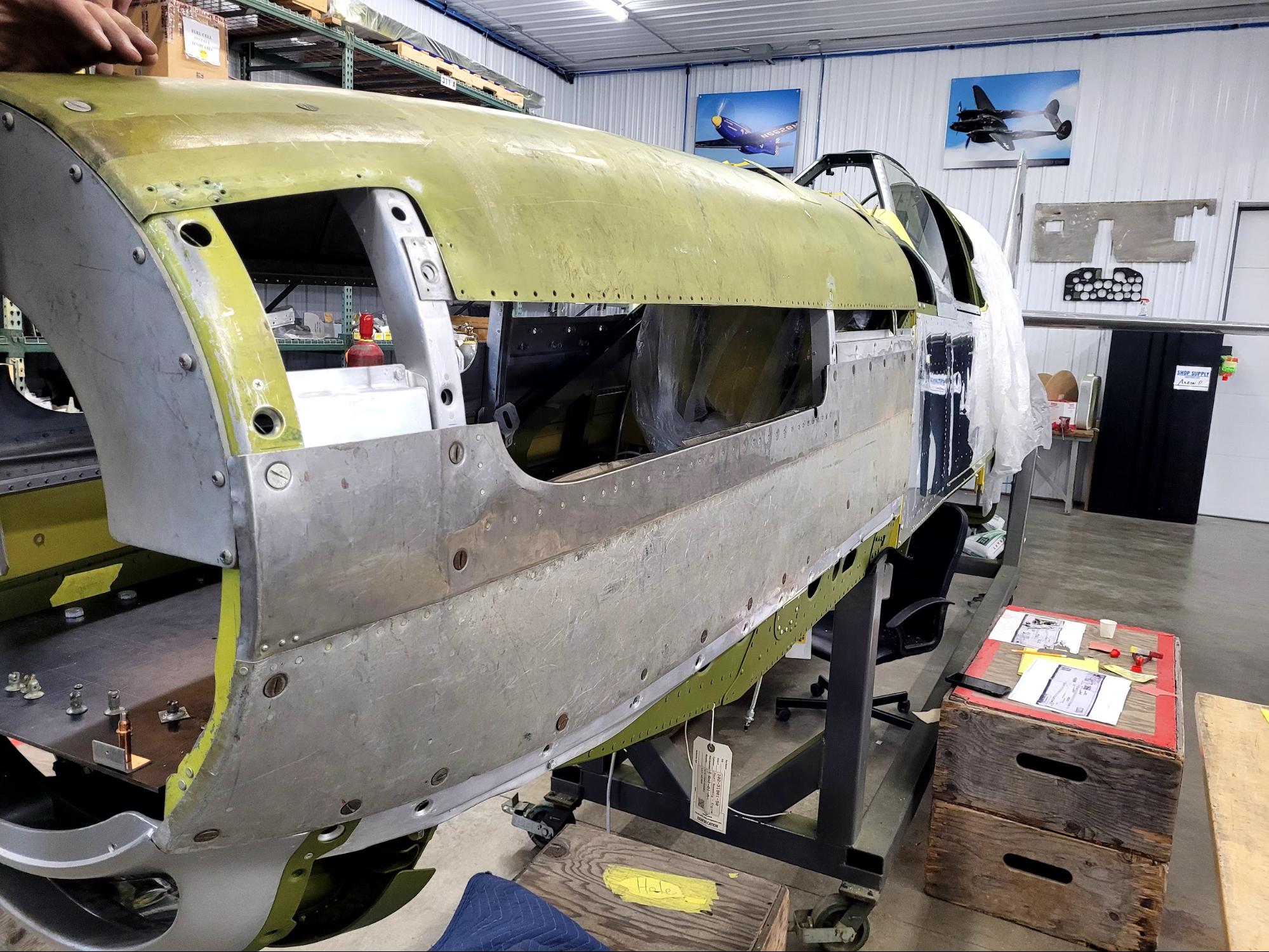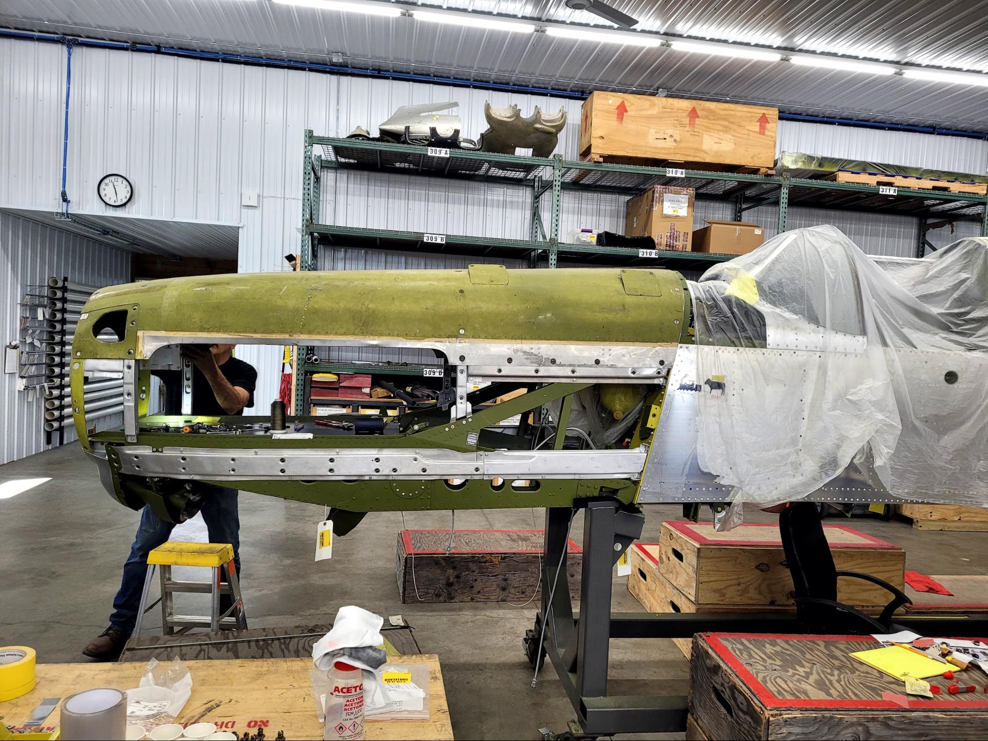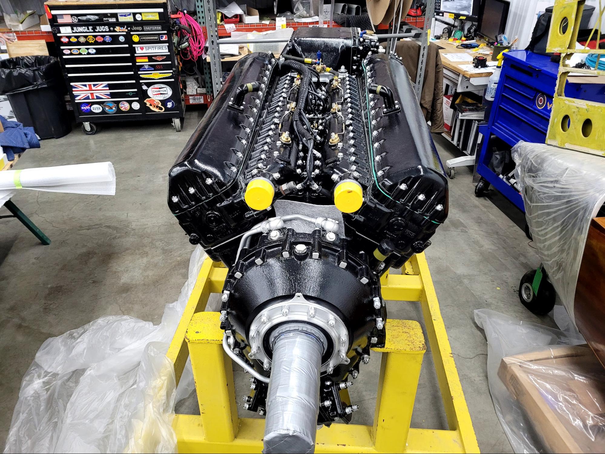 With many of the internal fuselage surface control systems in place, emphasis turned to the firewall forward section of the fuselage. The wing construction also continued, with more of the skin sections riveted in place permanently. The Merlin engine from Vintage V-12s was uncrated.