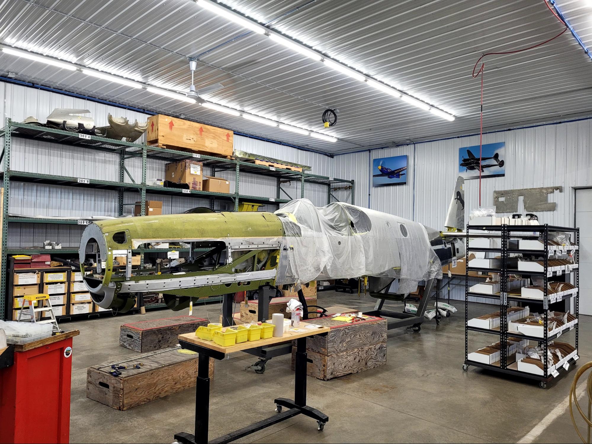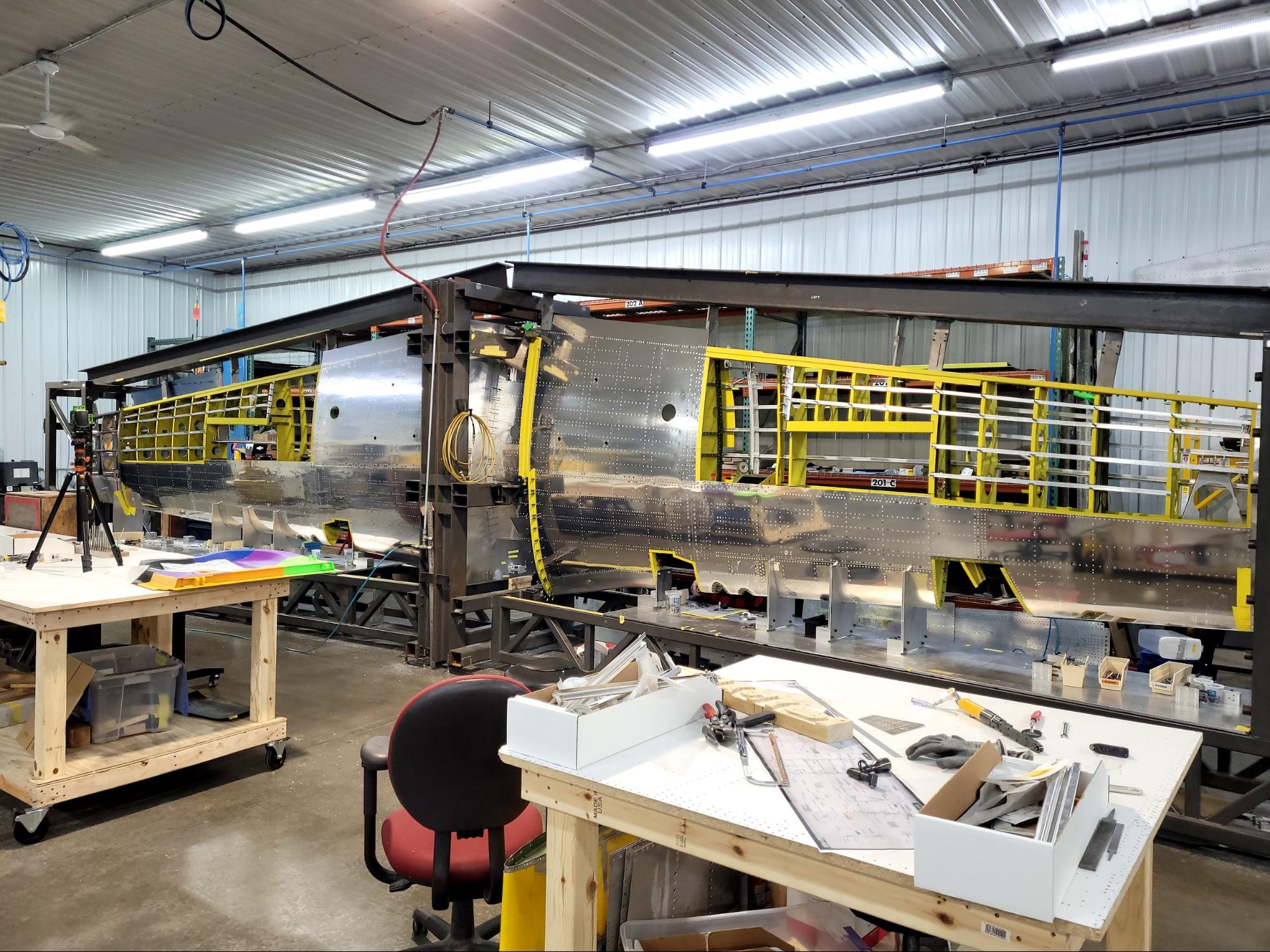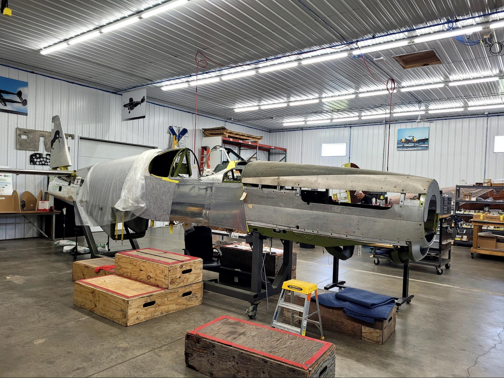 With many of the internal fuselage surface control systems in place, emphasis turned to the firewall forward section of the fuselage. The wing construction also continued, with more of the skin sections riveted in place permanently. The Merlin engine from Vintage V-12s was uncrated.