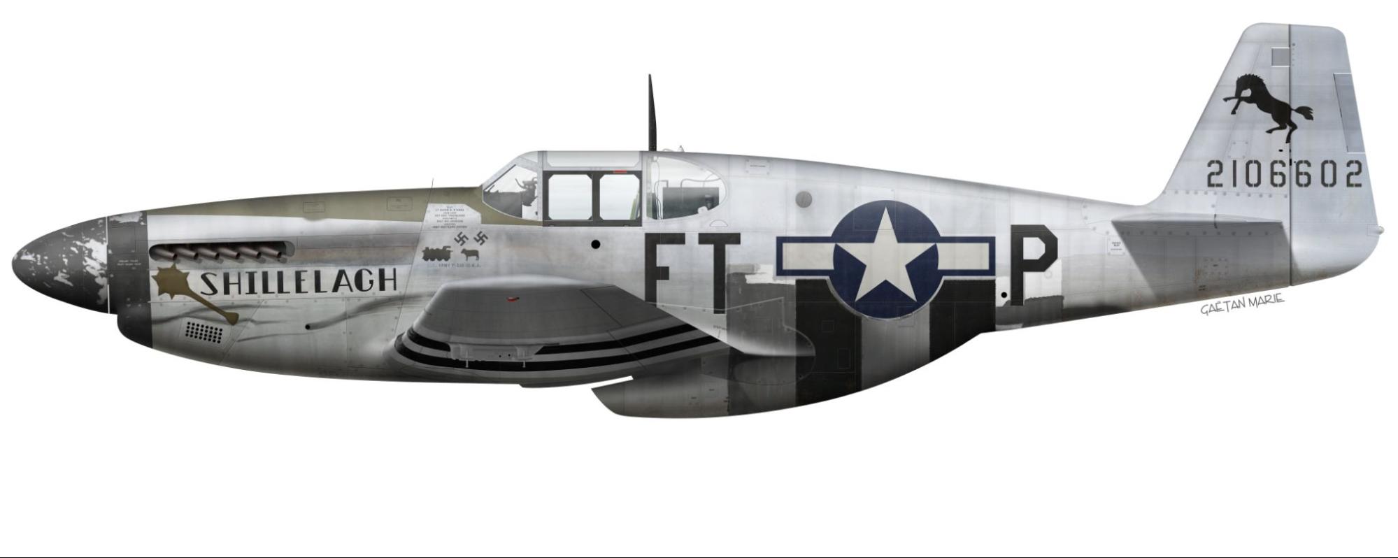 Served in 1944 with the 9th AF 354th FG 353rd FS, “Shillelagh” named by Lt. Col. David O’Hara. On 42-106602, the name was first spelled “Shillelaugh” and was later repainted at the depot level as “Shillelagh”.
