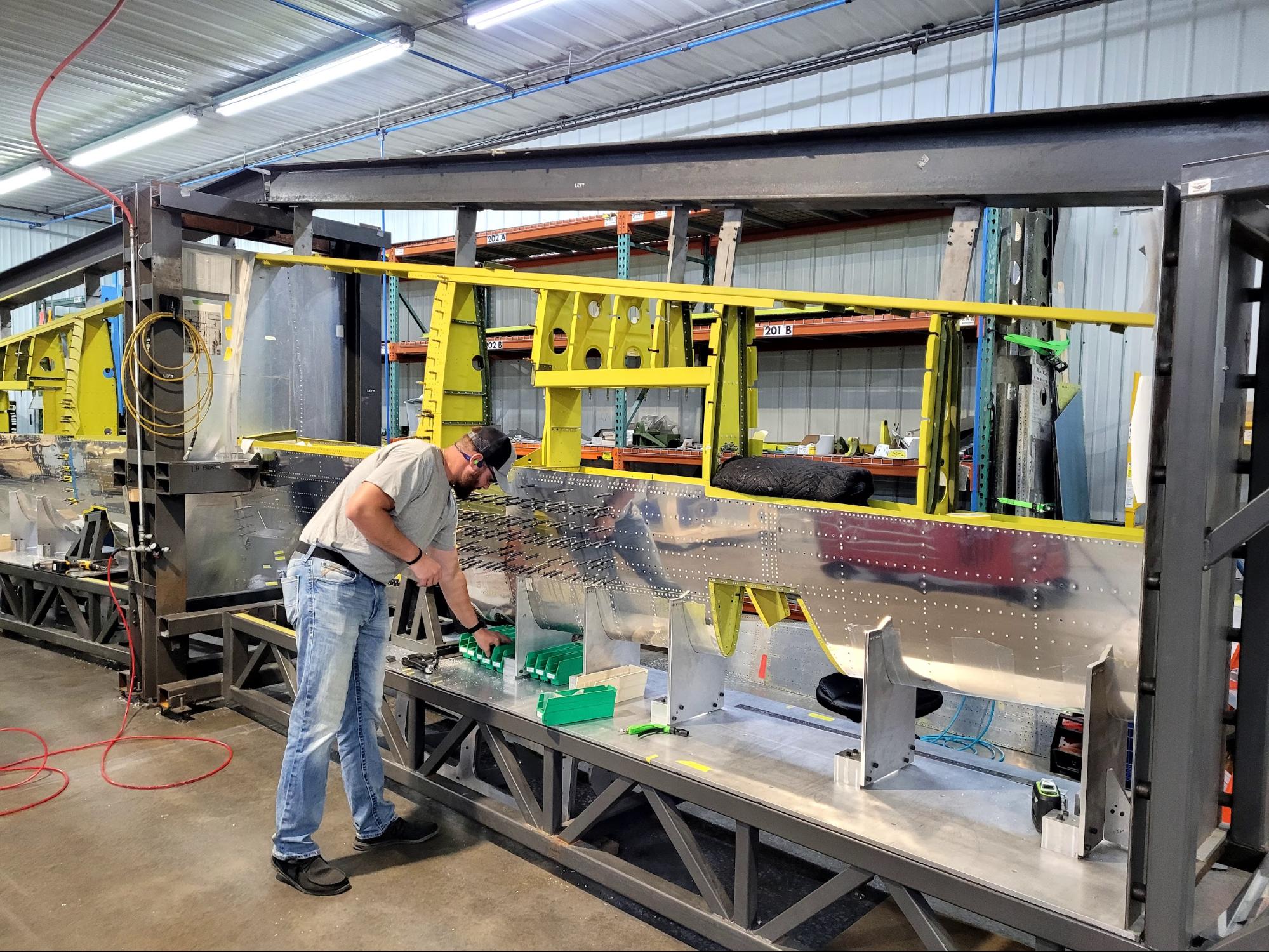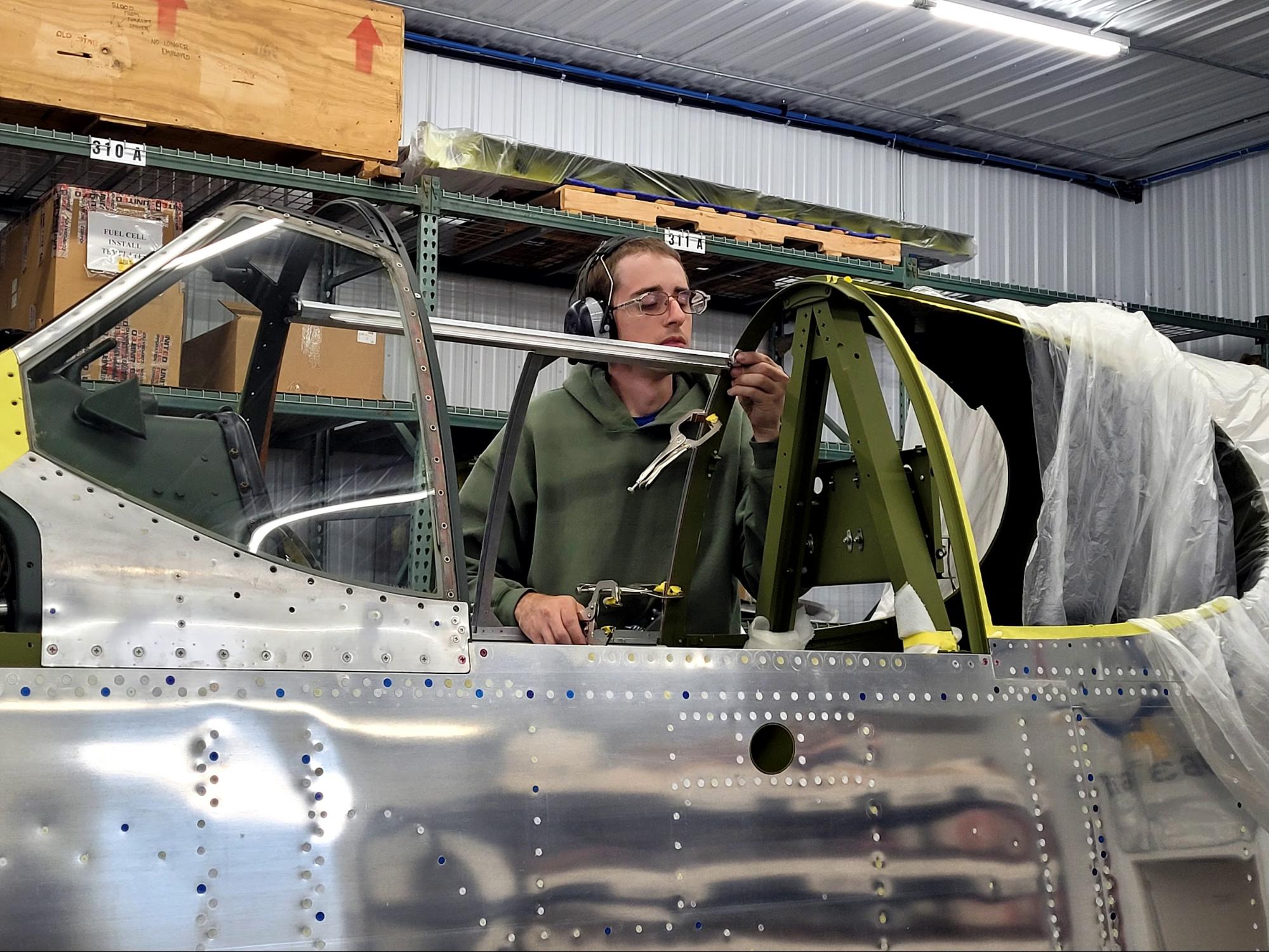Thousands of rivets secure the skin sections on a P-51 wing. The skins forward of the main spar were permanently riveted in place. The tank cover doors, which are installed under the fuel tanks and provide access, were readied.