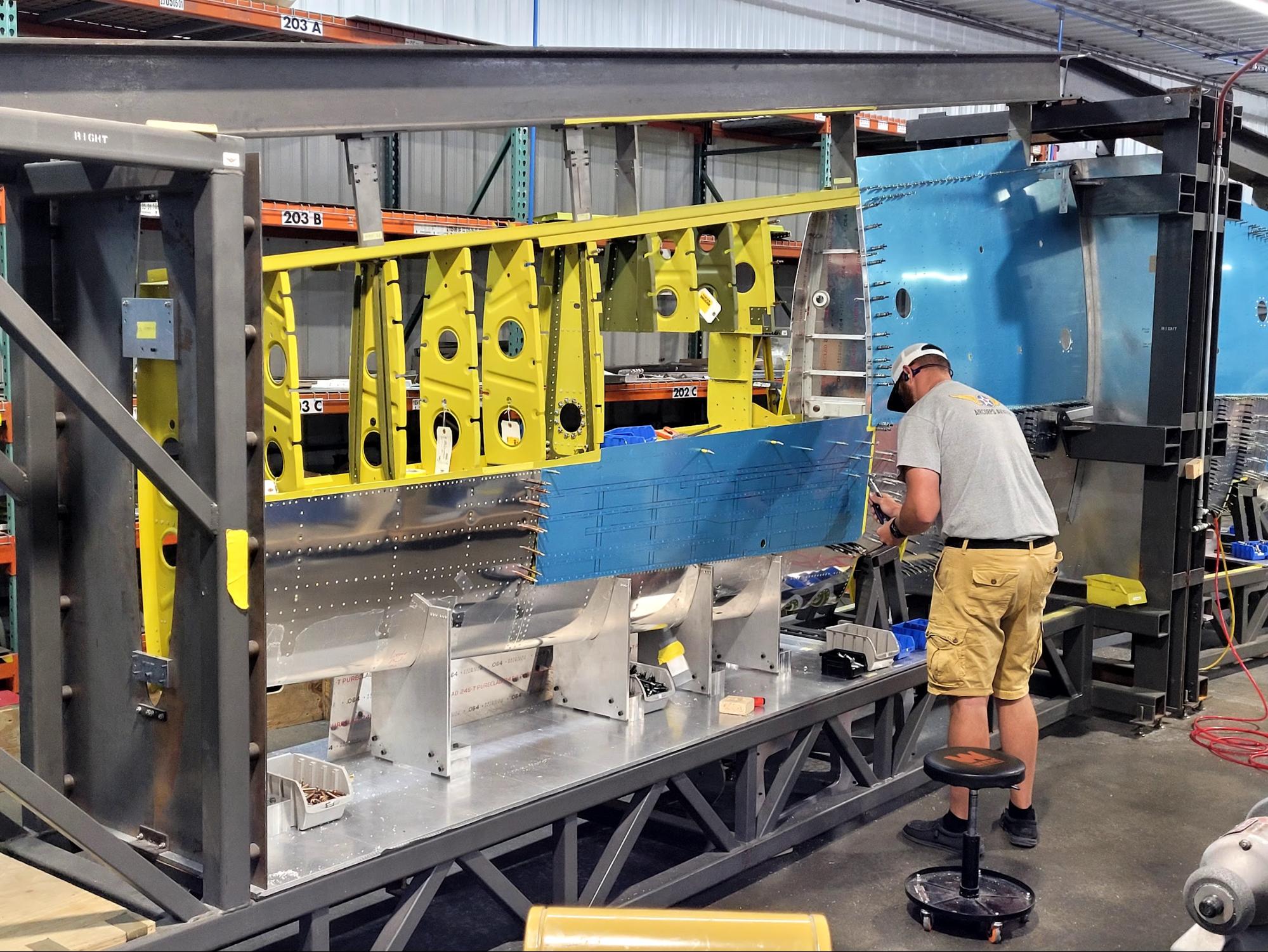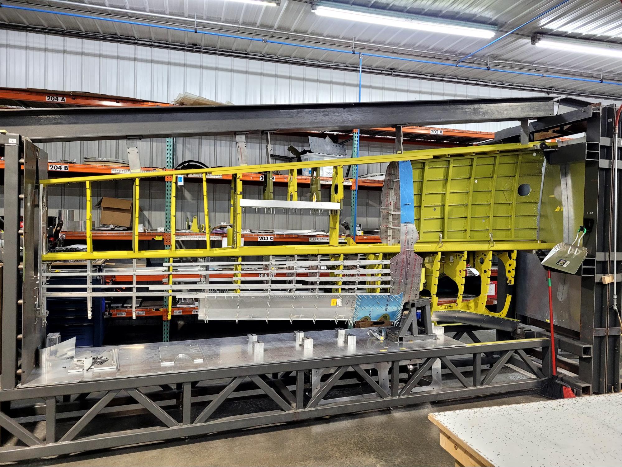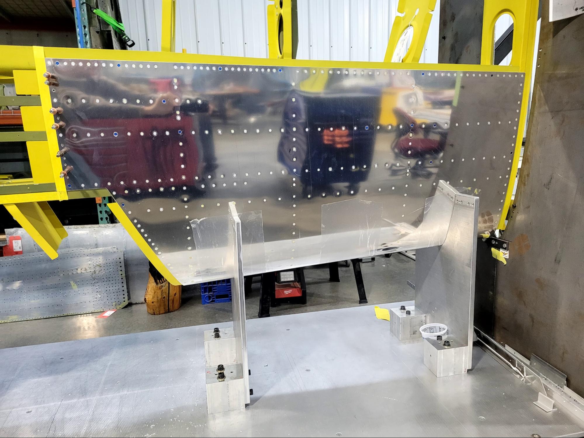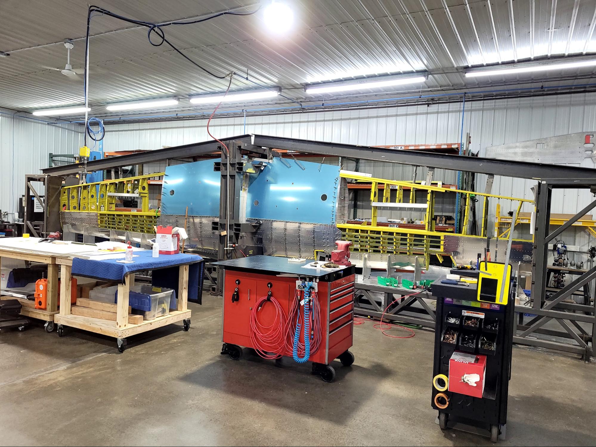 Construction of the wings is progressing nicely. The ribs, stringers, and spars have all been painted as necessary and assembled into the wing framework. The fitting of the wing skins to the frame is underway.