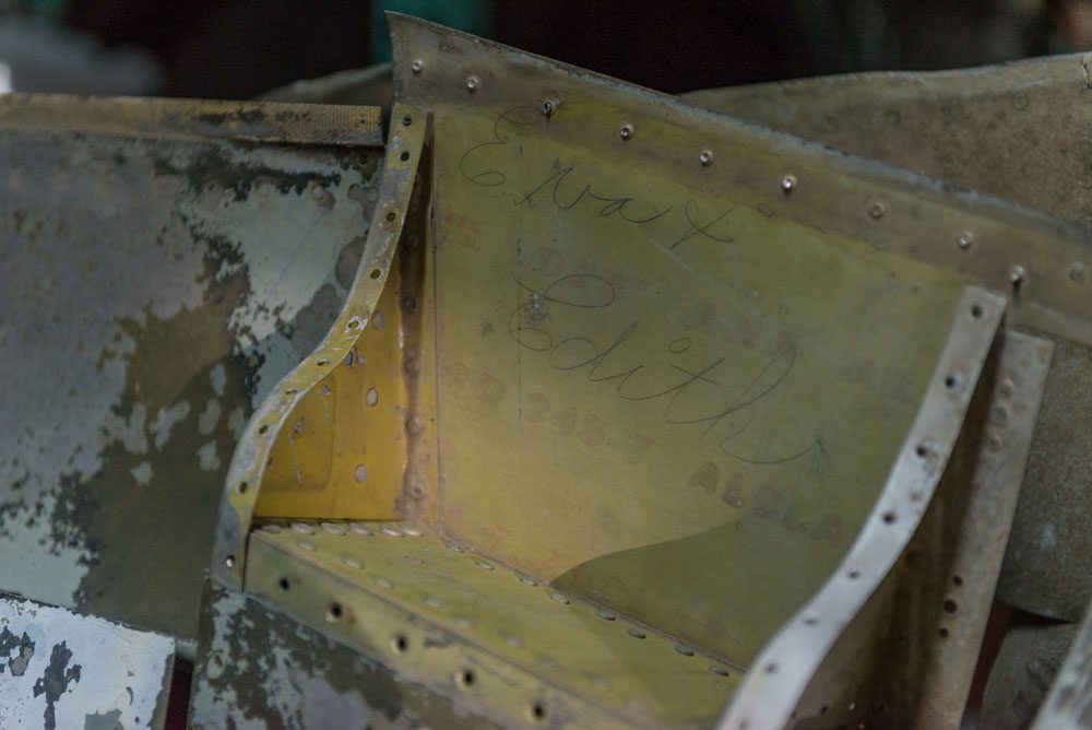 The Restoration team is focusing heavily on the P-47 Thunderbolt project in January. To help tell the stories behind the planes, hundreds, or even thousands, of photos are taken of individual parts, process steps, and the progress that occurs while they live at AirCorps. Clicking through them is always interesting, but there’s one in the Thunderbolt folder that immediately captures attention. This photo begs the questions: Who are Eva & Edith? Can we find them?